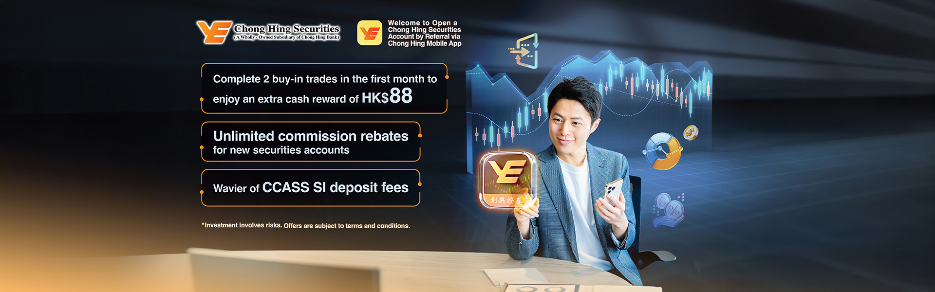 Special offer for new securities account holders: Enjoy a HK$100 welcome cash reward for opening a Chong Hing Securities account via Chong Hing Mobile Banking App of Chong Hing Bank referral.