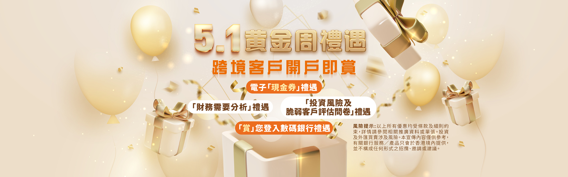 勞動節黃金周將至,創興銀行特別為大灣區跨境客戶的多元理財需求,呈獻全方位專屬理財方案,並隆重推出「5.1黃金周」推廣活動,帶來多重限時優惠及尊享禮遇,讓您盡享高達HK$588豐富獎賞!