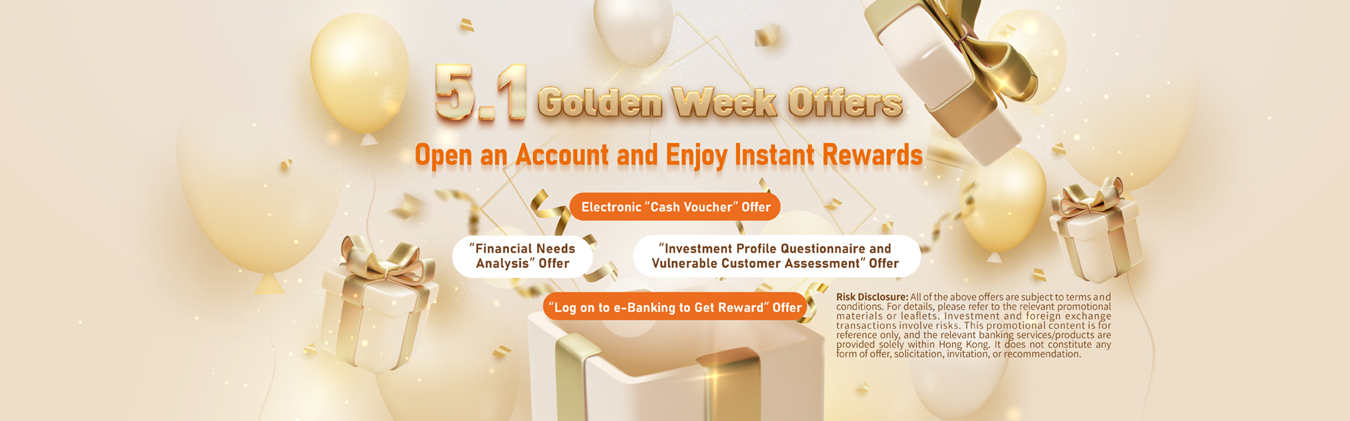 With the Labour Day Golden week approaching, Chong Hing Bank is pleased to present comprehensive wealth management solutions tailored to the diverse financial needs of cross-border customers in the Greater Bay Area. We are proud to launch the “5.1 Golden Week” Promotion, bringing you a variety of limited-time offers and exclusive privileges — allowing you to enjoy abundant rewards, enjoy abundant rewards up to HK$588!