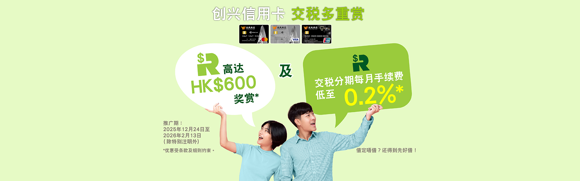 由2025年12月24日至2026年2月13日(「推廣期」),客戶憑創興信用卡於網上累積繳交稅款滿以下指定金額,並於推廣期內以創興信用卡的實體卡累積合資格零售簽賬滿HK$1,500或以上,可享高達100,000信用卡積分(「積分」)(等值HK$500現金回贈)!