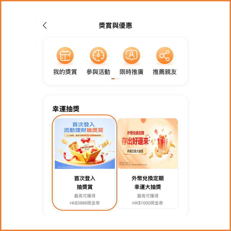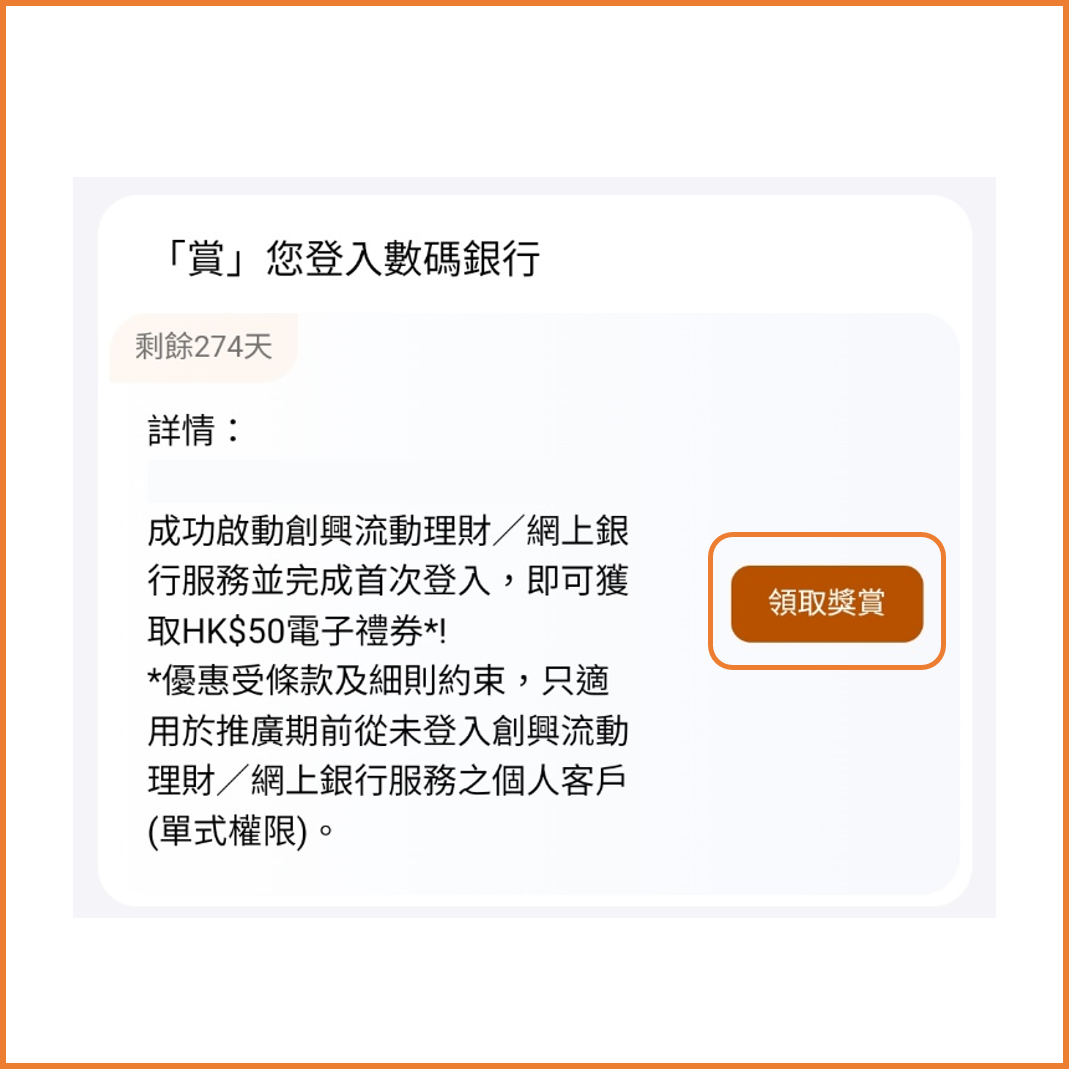 *高達HK$3,988獎賞包括:「首次登入流動理財抽獎賞」之高達HK$3,888現金券;以及「信用卡客戶首次登入流動理財,賞你HK$100電子禮券」之高達HK$100電子禮券。HK$100電子禮券將分為2張HK$50電子禮券發放,其中一張HK$50禮券需經創興流動理財應用程式自行領取,另一張HK$50電子禮券將於2026年1月31日或之前發放至客戶的流動理財內。