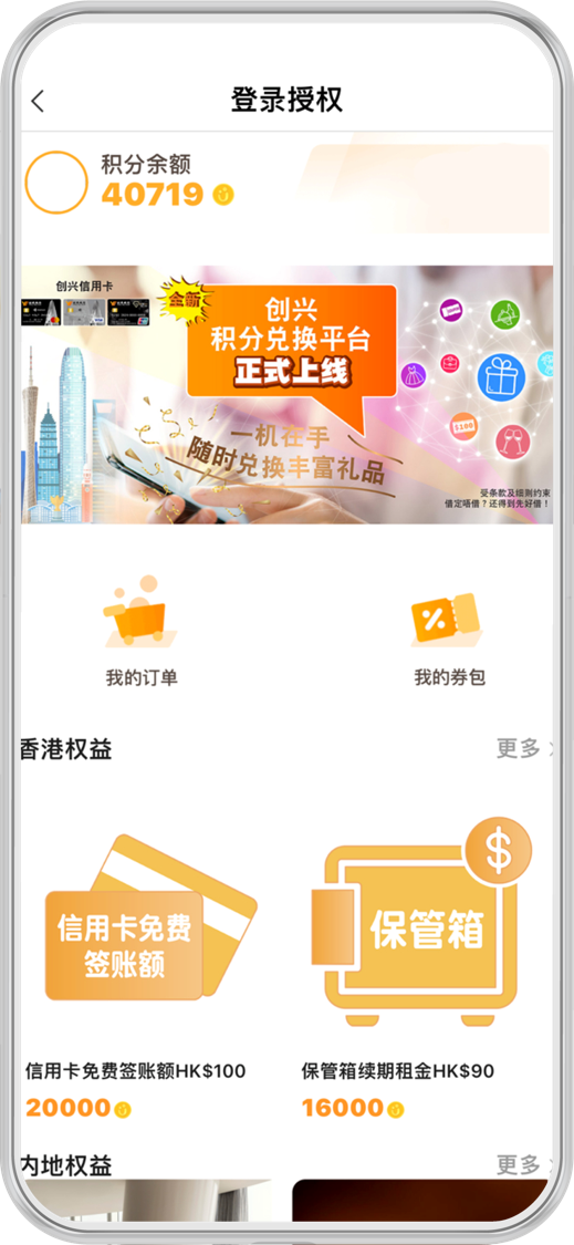 創興信用卡客戶(「客戶」)成功登入創興流動理財進入兌換平台,即可兌換香港及其他大灣區城巿商戶的指定優惠﹑信用卡免費簽賬額及免費銀行服務等。成功啟動創興流動理財並完成首次登入,尊享高達HK$100電子禮券*。