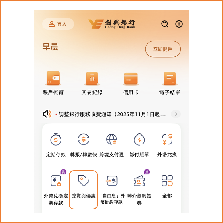 步驟1︰ • 登入創興流動理財應用程式 • 點選「獎賞與優惠」 |