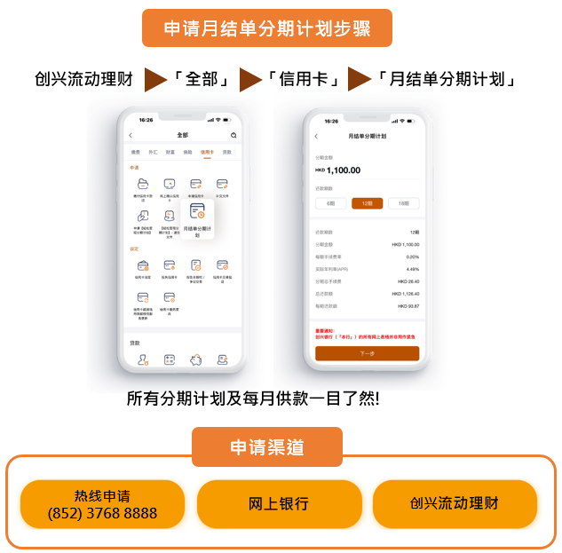 用创兴信用卡签账后,申请「月结单分期」计划,将卡数分期慢慢还,让您消费更尽情,理财更灵活。