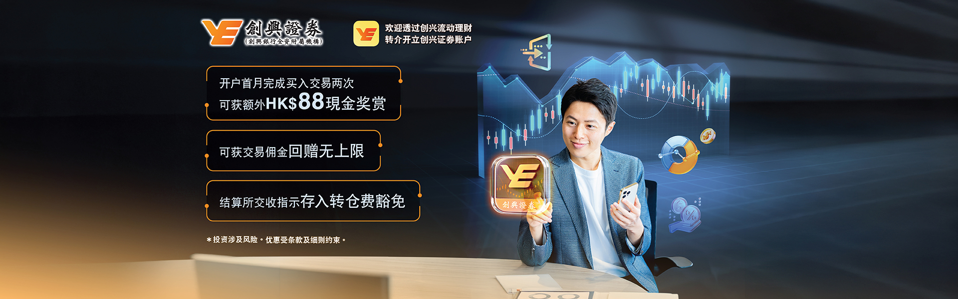全新证券开户特别优惠:透过创兴银行「创兴流动理财」转介开立创兴证券账户可享HK$100迎新现金奖赏。