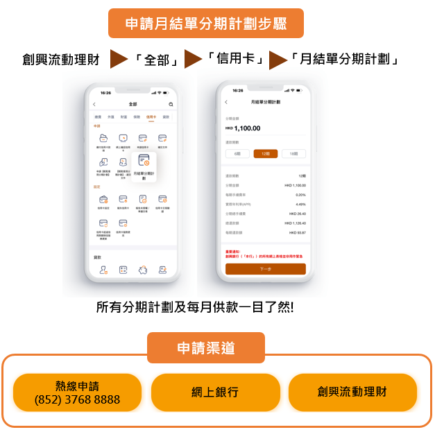 用創興信用卡簽賬後,申請「月結單分期」計劃,將卡數分期慢慢還,讓您消費更盡情,理財更靈活。